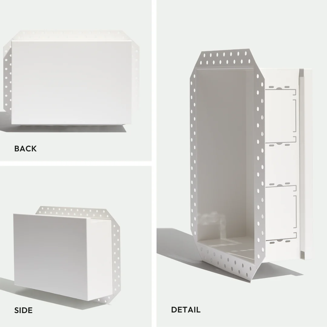 Ultra-minimalist recessed niche for storing pretty much anything you need to keep handy. Customizable with any material. Flush finish for a seamless design that blends right into the wall. Pro install in 30 minutes. Requires drywall mudding.